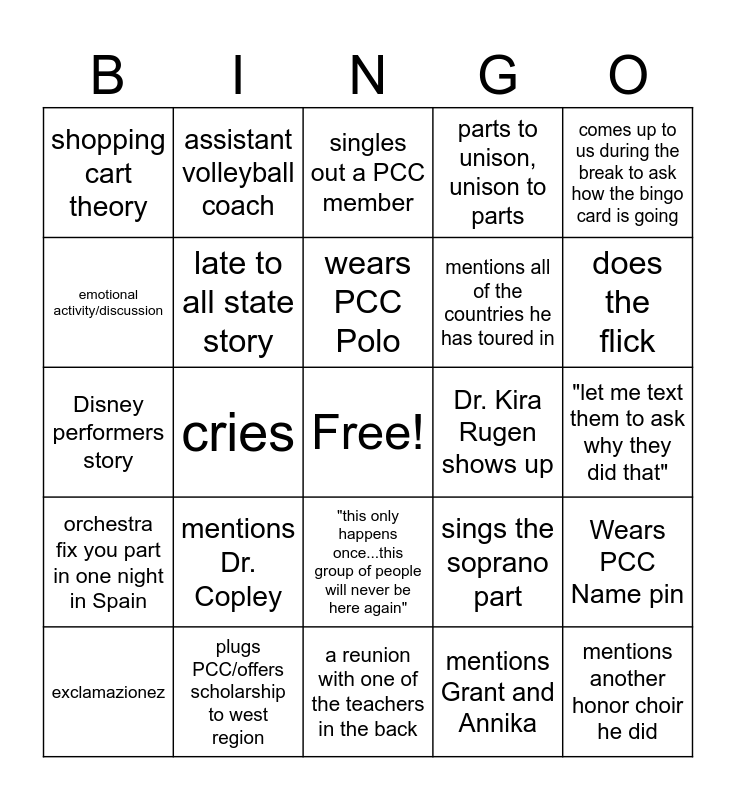 This bingo card has a free space and 24 words: exclamazionez, mentions Dr. Copley, wears PCC Polo, mentions Grant and Annika, comes up to us during the break to ask how the bingo card is going, shopping cart theory, assistant volleyball coach, singles out a PCC member, Dr. Kira Rugen shows up, "let me text them to ask why they did that", Disney performers story, late to all state story, sings the soprano part, Wears PCC Name pin, emotional activity/discussion, plugs PCC/offers scholarship to west region, a reunion with one of the teachers in the back, parts to unison, unison to parts, does the flick, orchestra fix you part in one night in Spain, cries, "this only happens once...this group of people will never be here again", mentions all of the countries he has toured in and mentions another honor choir he did.