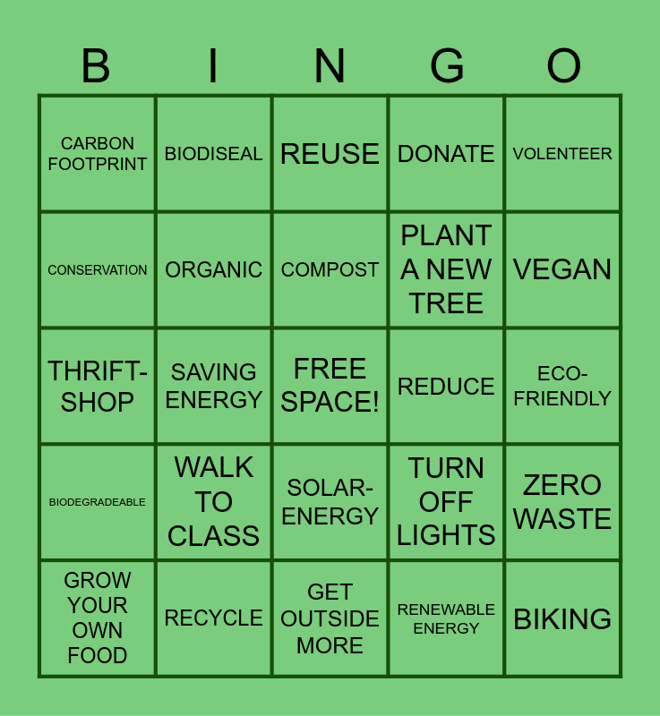 This bingo card has a free space and 24 words: WALK TO CLASS, RECYCLE, COMPOST, GROW YOUR OWN FOOD, VOLENTEER, CARBON FOOTPRINT, CONSERVATION, BIODISEAL, REDUCE, SOLAR-ENERGY, PLANT A NEW TREE, THRIFT-SHOP, TURN OFF LIGHTS, ZERO WASTE, ORGANIC, RENEWABLE ENERGY, ECO-FRIENDLY, REUSE, VEGAN, SAVING ENERGY, BIKING, BIODEGRADEABLE, DONATE and GET OUTSIDE MORE.