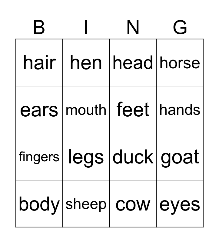 This bingo card has 16 words: sheep, goat, head, hair, fingers, hen, duck, cow, ears, mouth, body, horse, legs, hands, feet and eyes.