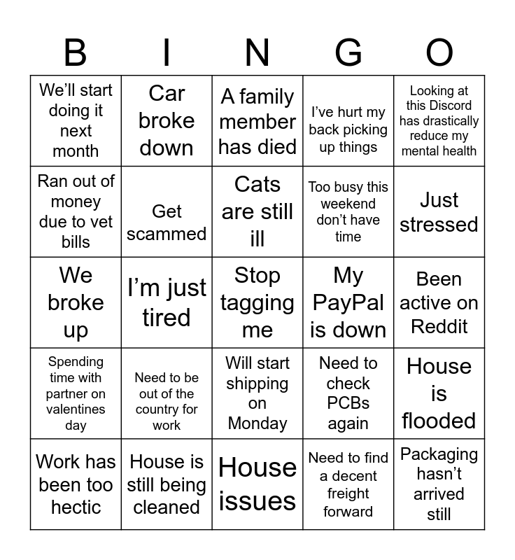 This bingo card has a free space and 24 words: Need to be out of the country for work, House is still being cleaned, Cats are still ill, Work has been too hectic, Looking at this Discord has drastically reduce my mental health, We’ll start doing it next month, Ran out of money due to vet bills, Car broke down, My PayPal is down, Will start shipping on Monday, Too busy this weekend don’t have time, We broke up, Need to check PCBs again, House is flooded, Get scammed, Need to find a decent freight forward, Been active on Reddit, A family member has died, Just stressed, I’m just tired, Packaging hasn’t arrived still, Spending time with partner on valentines day, I’ve hurt my back picking up things and House issues.