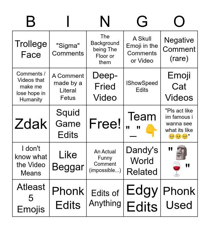 This bingo card has a free space and 24 words: Like Beggar, Phonk Edits, Deep-Fried Video, Atleast 5 Emojis, Negative Comment (rare), Trollege Face, Comments / Videos that make me lose hope in Humanity, "Sigma" Comments, Team "_" π, An Actual Funny Comment (impossible...), IShowSpeed Edits, Zdak, Dandy's World Related, "πΏπ·", A Comment made by a Literal Fetus, Edgy Edits, "Pls act like im famous i wanna see what its like π₯Ίπ₯Ίπ₯Ί", The Background being The Floor or them, Emoji Cat Videos, Squid Game Edits, Phonk Used, I don't know what the Video Means, A Skull Emoji in the Comments or Video and Edits of Anything.