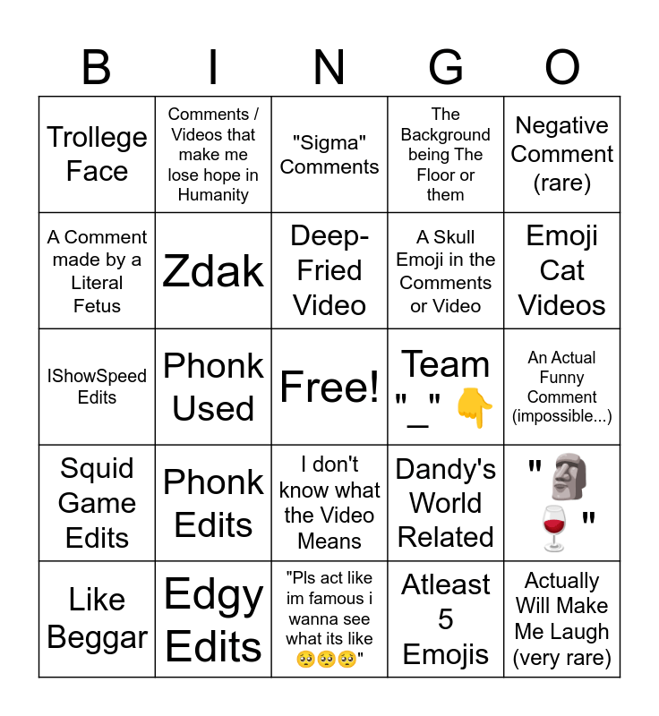 This bingo card has a free space and 24 words: Like Beggar, Phonk Edits, Deep-Fried Video, Atleast 5 Emojis, Negative Comment (rare), Trollege Face, Comments / Videos that make me lose hope in Humanity, "Sigma" Comments, Team "_" π, An Actual Funny Comment (impossible...), IShowSpeed Edits, Zdak, Dandy's World Related, "πΏπ·", A Comment made by a Literal Fetus, Edgy Edits, "Pls act like im famous i wanna see what its like π₯Ίπ₯Ίπ₯Ί", The Background being The Floor or them, Emoji Cat Videos, Squid Game Edits, Phonk Used, I don't know what the Video Means, A Skull Emoji in the Comments or Video and Actually Will Make Me Laugh (very rare).