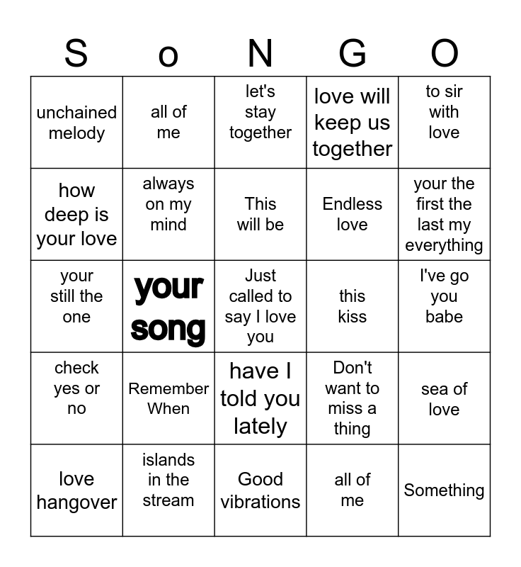 This bingo card has 25 words: Remember When, Good vibrations, This will be, love hangover, to sir with love, unchained melody, how deep is your love, all of me, this kiss, have I told you lately, Endless love, your still the one, Don't want to miss a thing, sea of love, always on my mind, Something, I've go you babe, let's stay together, your the first the last my everything, your song, Just called to say I love you, islands in the stream, check yes or no, love will keep us together and all of me.