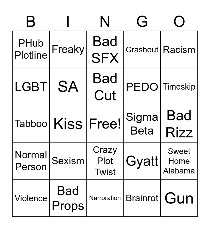 This bingo card has a free space and 24 words: Sexism, Bad Props, Bad Cut, Violence, Racism, PHub Plotline, LGBT, Freaky, Sigma Beta, Crazy Plot Twist, PEDO, Tabboo, Gyatt, Sweet Home Alabama, SA, Brainrot, Bad Rizz, Bad SFX, Timeskip, Kiss, Gun, Normal Person, Crashout and Narroration.