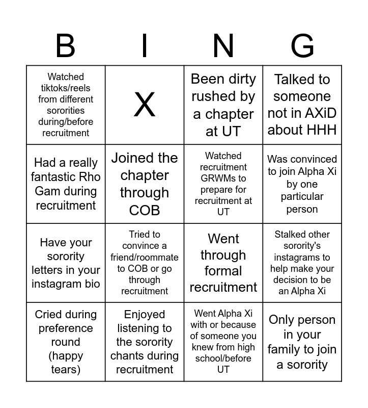 This bingo card has 16 words: Enjoyed listening to the sorority chants during recruitment, Stalked other sorority's instagrams to help make your decision to be an Alpha Xi, Been dirty rushed by a chapter at UT, Watched tiktoks/reels from different sororities during/before recruitment, Have your sorority letters in your instagram bio, X, Went through formal recruitment, Went Alpha Xi with or because of someone you knew from high school/before UT, Had a really fantastic Rho Gam during recruitment, Joined the chapter through COB, Cried during preference round (happy tears), Talked to someone not in AXiD about HHH, Tried to convince a friend/roommate to COB or go through recruitment, Was convinced to join Alpha Xi by one particular person, Watched recruitment GRWMs to prepare for recruitment at UT and Only person in your family to join a sorority.