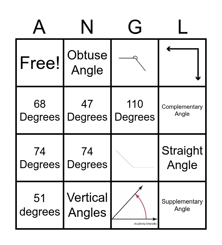 This bingo card has 11 images and 29 words: 40 Degrees, 47 Degrees, Angle A: 31 degrees Angle B: 149 degrees, Supplementary Angle, 51 degrees, Angle A: 19 degrees, 110 Degrees, 90 Degrees, Free!, Vertical Angles, 156 degrees, Complementary Angle, 68 Degrees, 74 Degrees, 180 Degrees, Angle A: 75 degrees Angle B: 75 degrees, Obtuse Angle, 180 Degrees, 74 Degrees, Measuring 1-79 Degrees, Straight Angle, 85 Degrees, 90 Degrees is a ___ angle, 180 Degrees is a ___ angle, Angles greater than 90 Degrees are called:, Angles greater than 90 Degrees but less than 180 are called:, Reflex Angle, A capital letter L would be an example of a ___ angle and The letter v would be an example of a ___ angle.