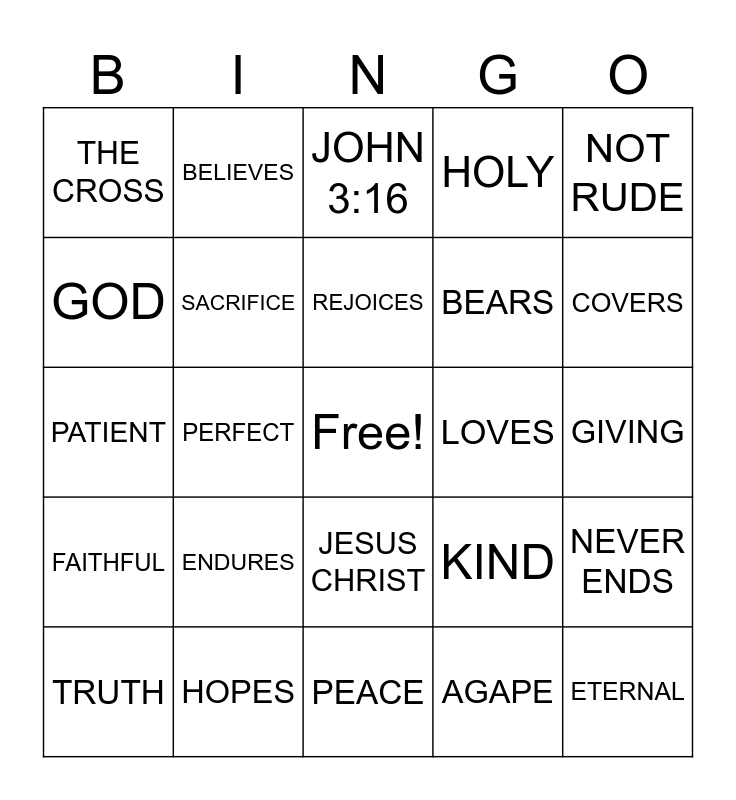 This bingo card has a free space and 24 words: ENDURES, HOPES, REJOICES, TRUTH, NOT RUDE, THE CROSS, GOD, BELIEVES, LOVES, JESUS CHRIST, BEARS, PATIENT, KIND, NEVER ENDS, SACRIFICE, AGAPE, GIVING, JOHN 3:16, COVERS, PERFECT, ETERNAL, FAITHFUL, HOLY and PEACE.