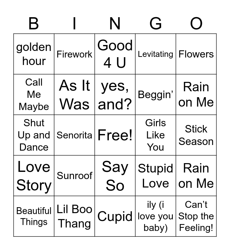 This bingo card has a free space and 24 words: Sunroof, Lil Boo Thang, yes, and?, Beautiful Things, Flowers, golden hour, Call Me Maybe, Firework, Girls Like You, Say So, Beggin’, Shut Up and Dance, Stupid Love, Rain on Me, As It Was, ily (i love you baby), Stick Season, Good 4 U, Rain on Me, Senorita, Can’t Stop the Feeling!, Love Story, Levitating and Cupid.