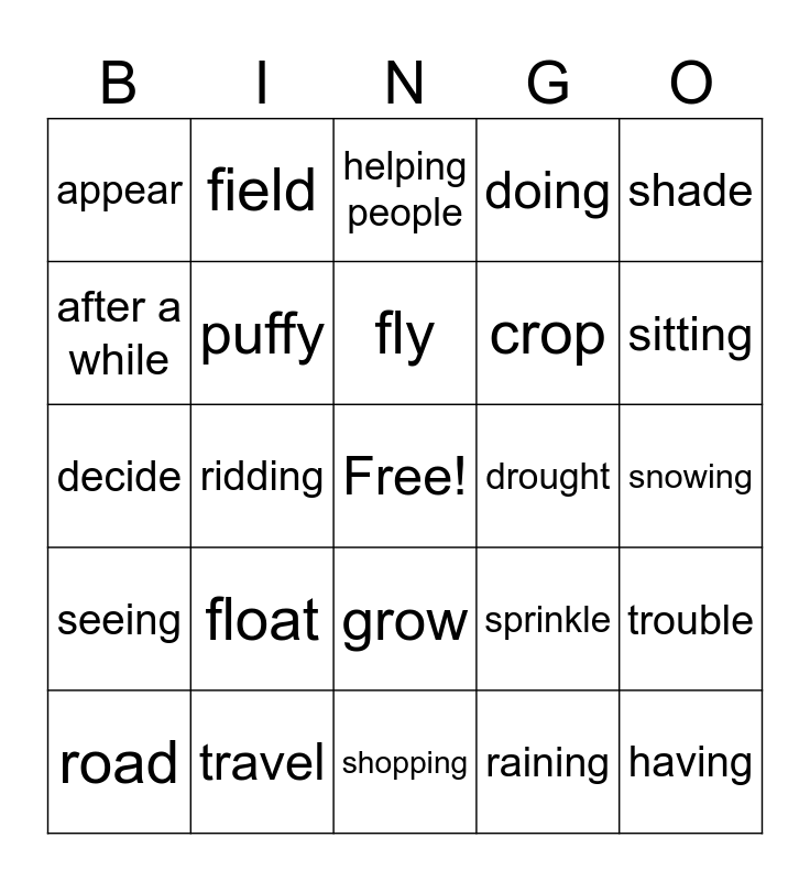 This bingo card has a free space and 24 words: float, travel, fly, road, shade, appear, after a while, field, drought, grow, crop, decide, sprinkle, trouble, puffy, raining, snowing, helping people, sitting, ridding, having, seeing, doing and shopping.