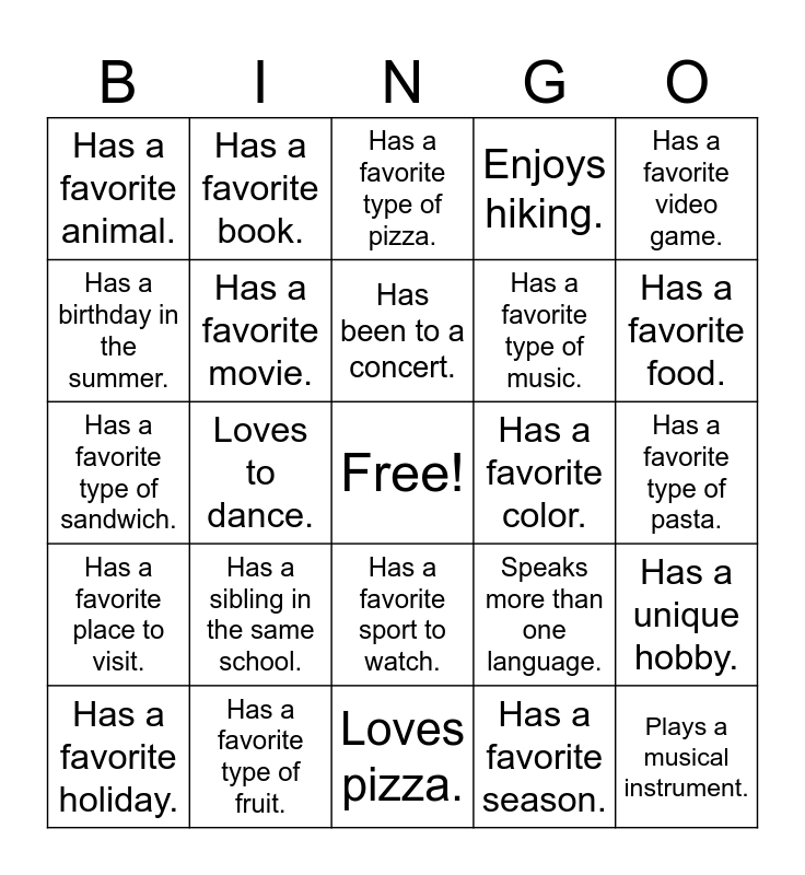 This bingo card has a free space and 49 words: Has a pet dog., Plays a musical instrument., Has traveled to another country., Loves pizza., Has a sibling in the same school., Plays a sport., Has a favorite book., Knows how to cook., Has a birthday in the summer., Loves to draw or paint., Has a favorite movie., Enjoys hiking., Has a unique hobby., Speaks more than one language., Has a favorite superhero., Loves chocolate., Has been to a concert., Has a favorite color., Enjoys reading comics., Has a favorite video game., Loves to dance., Has a favorite season., Has a favorite animal., Has a favorite type of music., Has a favorite TV show., Has a favorite food., Has a favorite holiday., Has a favorite subject in school., Has a favorite sport to watch., Has a favorite place to visit., Has a favorite type of dessert., Has a favorite type of candy., Has a favorite type of drink., Has a favorite type of snack., Has a favorite type of fruit., Has a favorite type of vegetable., Has a favorite type of meat., Has a favorite type of seafood., Has a favorite type of pasta., Has a favorite type of bread., Has a favorite type of cheese., Has a favorite type of sauce., Has a favorite type of soup., Has a favorite type of salad., Has a favorite type of sandwich., Has a favorite type of pizza., Has a favorite type of burger., Has a favorite type of hot dog. and Has a favorite type of sushi..