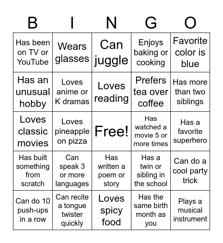 This bingo card has a free space and 50 words: Has a pet, Plays a musical instrument, Is left handed, Loves spicy food, Can speak 3 or more languages, Has traveled to another country, Wears glasses, Favorite subject is Math, Has an unusual hobby, Plays a sport, Loves anime or K dramas, Enjoys baking or cooking, Can do a cool party trick, Has a twin or sibling in the school, Wakes up before 6 AM, Can solve a Rubiks cube, Loves reading, Has watched a movie 5 or more times, Knows a dance move, Favorite color is blue, Loves pineapple on pizza, Has the same birth month as you, Has been on TV or YouTube, Prefers tea over coffee, Can whistle, Has met a celebrity, Has more than two siblings, Loves hiking or outdoor adventures, Can juggle, Has written a poem or story, Can touch their toes without bending knees, Has never broken a bone, Loves science experiments, Has won a competition before, Can recite a tongue twister quickly, Has donated to a charity, Knows how to knit or crochet, Loves board games, Has performed on stage before, Has a favorite superhero, Can name all the planets in the solar system, Has been to a live concert, Knows how to swim, Has ridden a horse before, Can do 10 push-ups in a row, Loves classic movies, Has tried a really unusual food, Has volunteered for a cause, Has built something from scratch and Knows how to do origami.