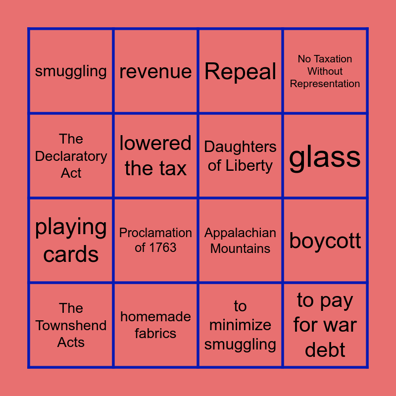 This bingo card has 20 words: boycott, The Stamp Act, Repeal, George Grenville, The Townshend Acts, The Declaratory Act, homemade fabrics, smuggling, playing cards, revenue, Proclamation of 1763, Appalachian Mountains, lowered the tax, to pay for war debt, Daughters of Liberty, before, glass, No Taxation Without Representation, to minimize smuggling and Parliament.