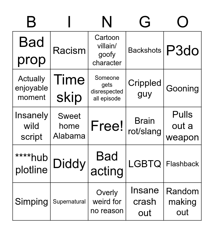 This bingo card has a free space and 24 words: Diddy, Supernatural, Someone gets disrespected all episode, Simping, P3do, Bad prop, Actually enjoyable moment, Racism, Brain rot/slang, Bad acting, Crippled guy, Insanely wild script, LGBTQ, Flashback, Time skip, Insane crash out, Pulls out a weapon, Cartoon villain/ goofy character, Gooning, Sweet home Alabama, Random making out, ****hub plotline, Backshots and Overly weird for no reason.
