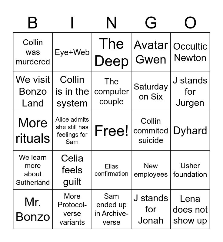 This bingo card has a free space and 24 words: Mr. Bonzo, Celia feels guilt, The computer couple, J stands for Jonah, Occultic Newton, Collin was murdered, Eye+Web, The Deep, Collin commited suicide, Dyhard, More rituals, Collin is in the system, New employees, Usher foundation, We visit Bonzo Land, More Protocol-verse variants, Sam ended up in Archive-verse, Avatar Gwen, J stands for Jurgen, We learn more about Sutherland, Alice admits she still has feelings for Sam, Elias confirmation, Saturday on Six and Lena does not show up.