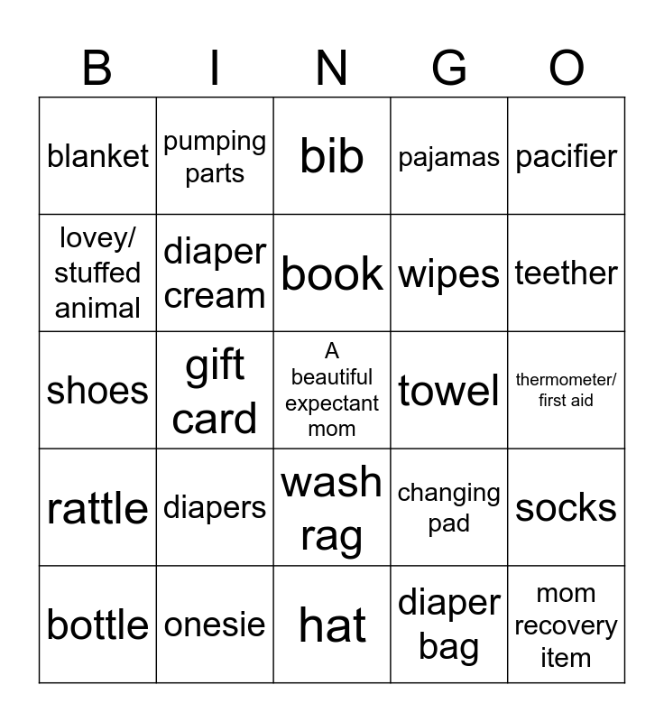 This bingo card has a free space and 24 words: diapers, onesie, book, bottle, pacifier, blanket, lovey/ stuffed animal, pumping parts, towel, wash rag, wipes, shoes, changing pad, socks, diaper cream, diaper bag, thermometer/ first aid, bib, teether, gift card, mom recovery item, rattle, pajamas and hat.