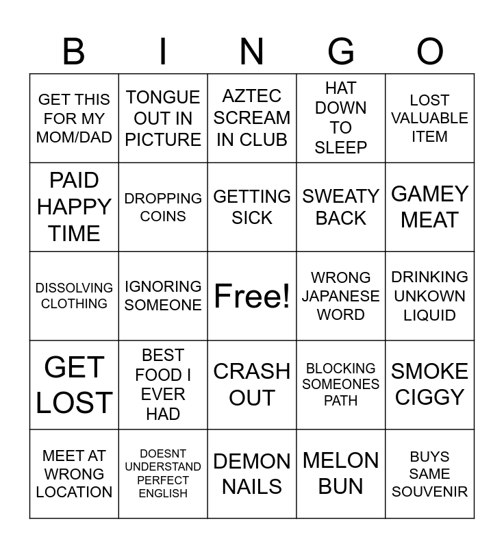 This bingo card has a free space and 24 words: BEST FOOD I EVER HAD, DOESNT UNDERSTAND PERFECT ENGLISH, GETTING SICK, MEET AT WRONG LOCATION, LOST VALUABLE ITEM, GET THIS FOR MY MOM/DAD, PAID HAPPY TIME, TONGUE OUT IN PICTURE, WRONG JAPANESE WORD, CRASH OUT, SWEATY BACK, DISSOLVING CLOTHING, BLOCKING SOMEONES PATH, SMOKE CIGGY, DROPPING COINS, MELON BUN, DRINKING UNKOWN LIQUID, AZTEC SCREAM IN CLUB, GAMEY MEAT, IGNORING SOMEONE, BUYS SAME SOUVENIR, GET LOST, HAT DOWN TO SLEEP and DEMON NAILS.