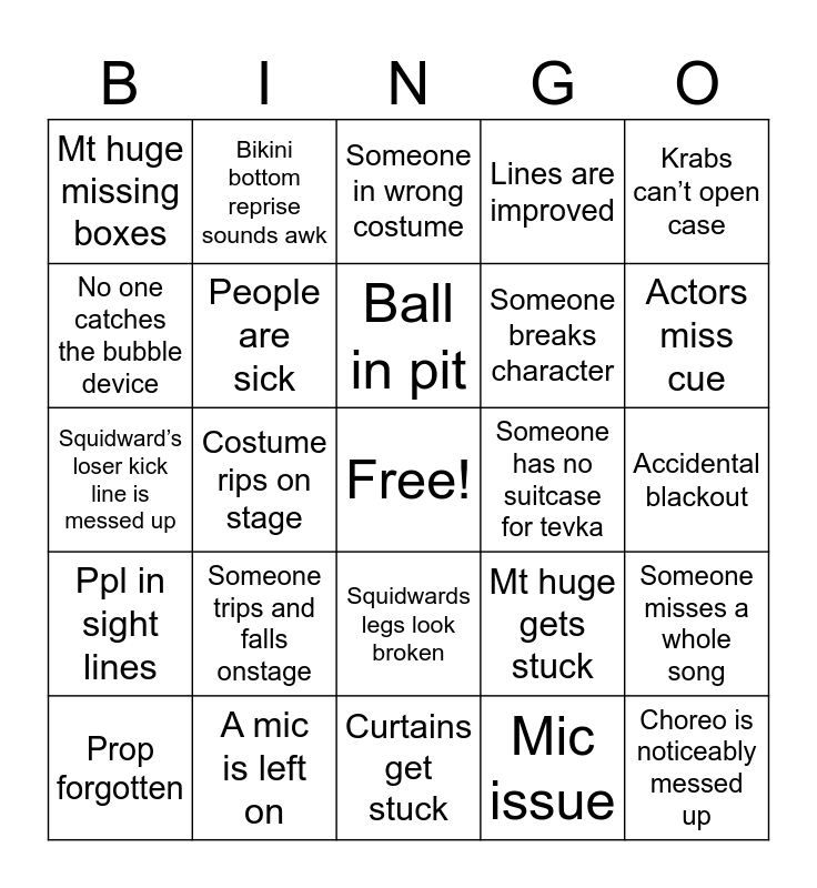 This bingo card has a free space and 24 words: Someone trips and falls onstage, A mic is left on, Ball in pit, Prop forgotten, Krabs can’t open case, Mt huge missing boxes, No one catches the bubble device, Bikini bottom reprise sounds awk, Someone has no suitcase for tevka, Squidwards legs look broken, Someone breaks character, Squidward’s loser kick line is messed up, Mt huge gets stuck, Someone misses a whole song, People are sick, Mic issue, Accidental blackout, Someone in wrong costume, Actors miss cue, Costume rips on stage, Choreo is noticeably messed up, Ppl in sight lines, Lines are improved and Curtains get stuck.