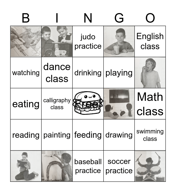 This bingo card has 8 images, a free space and 16 words: painting, drinking, English class, watching, feeding, playing, eating, drawing, swimming class, dance class, soccer practice, Math class, judo practice, calligraphy class, reading and baseball practice.
