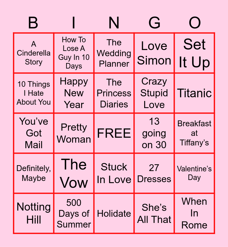 This bingo card has a free space and 50 words: Bridget Jones Diary, When In Rome, Something Borrowed, Holidate, The Vow, The Holiday, How To Lose A Guy In 10 Days, Ella Enchanted, 10 Things I Hate About You, To All The Boys I’ve Loved Before, Happy New Year, Love Simon, Valentine’s Day, 27 Dresses, She’s The Man, The Proposal, The Princess Diaries, 13 going on 30, When Harry Met Sally, Set It Up, Pretty Woman, She’s All That, A Cinderella Story, Crazy Stupid Love, 50 First Dates, Crazy Rich Asians, Titanic, The Fault In Our Stars, The Wedding Planner, Stuck In Love, The Last Song, Letters To Juliet, He’s Just Not That Into You, Sleepless in Seattle, 500 Days of Summer, Say Anything, Someone Great, Silver Lining’s Playbook, The Princess Bride, Breakfast at Tiffany’s, Sweet Home Alabama, Four Weddings and a Funeral, Mamma Mia!, Forgetting Sarah Marshall, Notting Hill, You’ve Got Mail, Love Actually, The Big Sick, Definitely, Maybe and My Big Fat Greek Wedding.