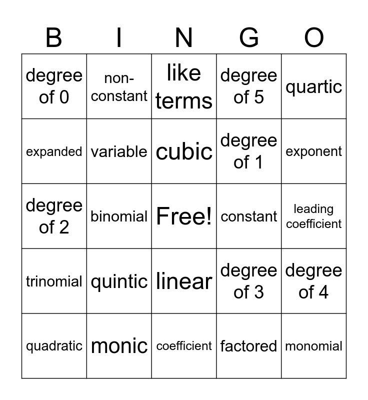 This bingo card has a free space and 24 words: quintic, monic, cubic, quadratic, quartic, degree of 0, expanded, non-constant, constant, linear, degree of 1, degree of 2, degree of 3, degree of 4, variable, factored, leading coefficient, like terms, exponent, binomial, monomial, trinomial, degree of 5 and coefficient.