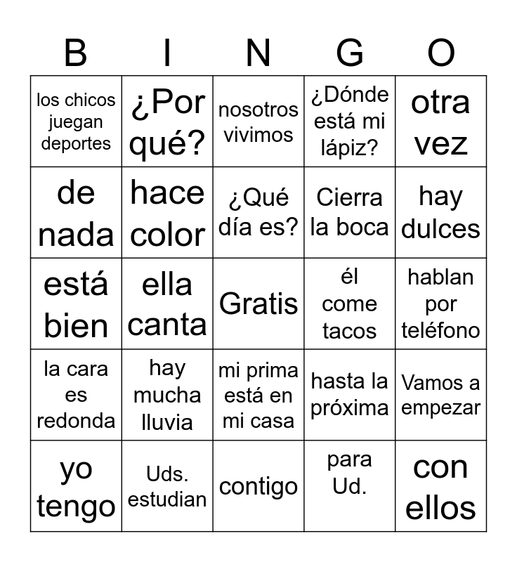 This bingo card has a free space and 29 words: yo tengo, tú haces, ella canta, las chicas bailan, los chicos juegan deportes, nosotros vivimos, hace color, hay mucha lluvia, él come tacos, Uds. estudian, hablan por teléfono, con ellos, contigo, para Ud., hay dulces, aquí es tu nota, mi prima está en mi casa, la cara es redonda, otra vez, está bien, hasta la próxima, ¿Quién es?, Cierra la boca, de nada, ¿Dónde está mi lápiz?, ¿Por qué?, Vamos a empezar, ¿Qué día es? and ¿Cuándo es tu cumpleaños?.