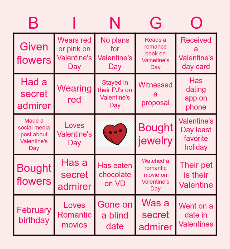This bingo card has a free space and 29 words: February birthday, Received flowers, Loves Valentine's Day, Read a romance book, Given flowers, No plans for Valentine's Day, Wearing red, Has a secret admirer, Bought jewelry, Loves Romantic movies, Valentine's Day least favorite holiday, Went on a date in Valentines, Gone on a blind date, Was a secret admirer, Has dating app on phone, Eaten in a restaurant on Valentine's Day, Has eaten chocolate on VD, Bought flowers, Received a Valentine's day card, Made a social media post about Valentine's Day, Watched a romantic movie on Valentine's Day, Has eaten ice cream on VD, Witnessed a proposal, Had a secret admirer, Reads a romance book on Valnetine's Day, Wears red or pink on Valentine's Day, Their pet is their Valentine, Stayed in their PJ's on Valentine's Day and Cooked food for their Valentine.