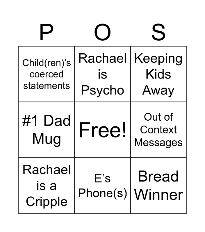 This bingo card has a free space and 13 words: Ketamine, GWD Abuse/Manipulation, Rachael is a Cripple, Rachael is Psycho, #1 Dad Mug, Bread Winner, BJJ Anything, Alienation, E’s Phone(s), Child(ren)’s coerced statements, Out of Context Messages, Keeping Kids Away and Super Native This Guy.