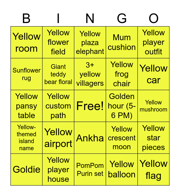 This bingo card has a free space and 24 words: Yellow airport, Yellow player house, 3+ yellow villagers, Goldie, Yellow player outfit, Yellow room, Sunflower rug, Yellow flower field, Golden hour (5-6 PM), Ankha, Yellow frog chair, Yellow pansy table, Yellow crescent moon, Yellow star pieces, Giant teddy bear floral, Yellow balloon, Yellow mushroom, Yellow plaza elephant, Yellow car, Yellow custom path, Yellow flag, Yellow-themed island name, Mum cushion and PomPom Purin set.