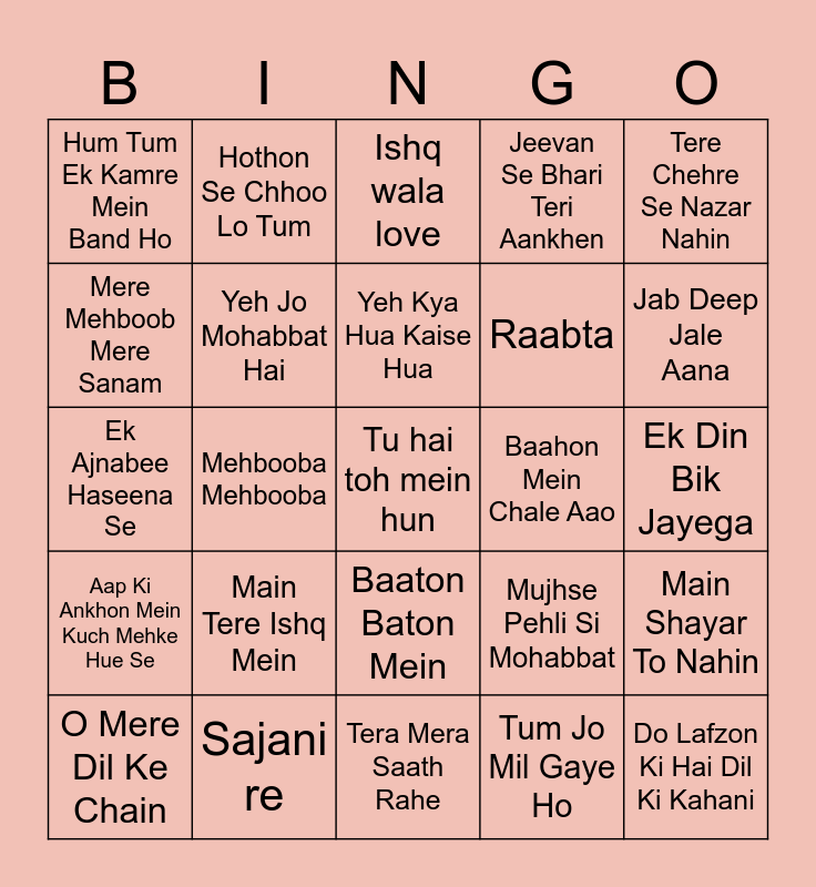 This bingo card has a free space and 60 words: Chura Liya Hai Tumne Jo Dil Ko, Sajani re, Ek Pyar Ka Nagma Hai, Aap Ki Ankhon Mein Kuch Mehke Hue Se, Tum Jo Mil Gaye Ho, Ek Ajnabee Haseena Se, Yeh Jo Mohabbat Hai, Maine Tere Liye Hi Saat Rang Ke Sapne, Raabta, Tera Mujhse Hai Pehle Ka Naata Koi, Jeevan Se Bhari Teri Aankhen, Dheere Dheere se Meri Zindagi mein anna, Mere Mehboob Mere Sanam, Roop Tera Mastana, Dil Kya Kare Jab Kisi Se, Hum Tum Ek Kamre Mein Band Ho, Do Lafzon Ki Hai Dil Ki Kahani, Tere Chehre Se Nazar Nahin, Rimjhim Gire Saawan, Yeh Kya Hua Kaise Hua, Baahon Mein Chale Aao, Ishq wala love, O Mere Dil Ke Chain, Main Shayar To Nahin, Bheegi Bheegi Raaton Mein, Mujhe Teri Mohabbat Ka Sahara, Tum Bin Jaun Kahan, Yeh Shaam Mastani, Jab Deep Jale Aana, Tere Mere Milan Ki Yeh Raina, O Saathi Re Tere Bina Bhi Kya Jeena, Samne Yeh Kaun Aaya, Kya Hua Tera Wada, Wada Karo Nahin Chhodoge, Hothon Se Chhoo Lo Tum, Aaj Mausam Bada Beimaan Hai, Mere Dil Mein Aaj Kya Hai, Mehbooba Mehbooba, Aa Jane Jaan, Ek Ajnabee Haseena Se, Bahon Mein Chale Aao, Main Tere Ishq Mein, Ek Din Bik Jayega, Khaike Paan Banaras Wala, Mujhse Pehli Si Mohabbat, Raat Kali Ek Khwab Mein Aayi, Dil Deta Hai Ro Ro Duhai, Ab Ke Sawan Aise Barse, Tumhe Dekhti Hoon, Baaton Baton Mein, Tera Mera Saath Rahe, Pyar Diwana Hota Hai, Tum Pukar Lo, Tumse Milke Aisa Laga, Yeh Raaten Yeh Mausam, Mere Sapno Ki Rani Kab Aayegi Tu, Phoolon Ka Taron Ka, Yeh Chand Sa Roshan Chehra, Chand Mera Dil Chandni Ho Tum and Dil Se Teri Nigah.