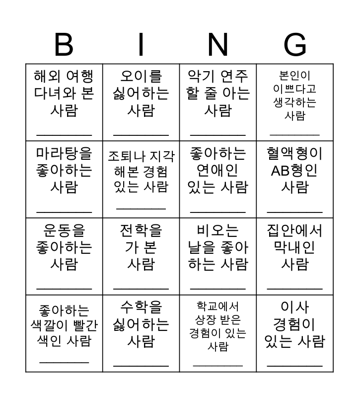 This bingo card has 20 words: 집안에서 막내인 사람 _______, 반려동물 키우는 사람_______, 악기 연주할 줄 아는 사람_______, 나와 같은 달에 태어난 사람 _______, 좋아하는 색깔이 빨간색인 사람 _______, 마라탕을 좋아하는 사람 _______, 수학을 싫어하는 사람 _______, 해외 여행 다녀와 본 사람 _______, 운동을 좋아하는 사람 _______, 오이를 싫어하는 사람 _______, 전학을 가 본 사람 _______, 비오는 날을 좋아하는 사람 _______, 조퇴나 지각 해본 경험 있는 사람 _______, 이사 경험이 있는 사람 _______, 좋아하는 연애인 있는 사람 _______, 노래방 가기 좋아하는 사람 _______, 혈액형이 AB형인 사람 _______, 본인이 이쁘다고 생각하는 사람 ________, 학교에서 상장 받은 경험이 있는 사람 ________ and 노래방 가기 좋아하는 사람 _______.
