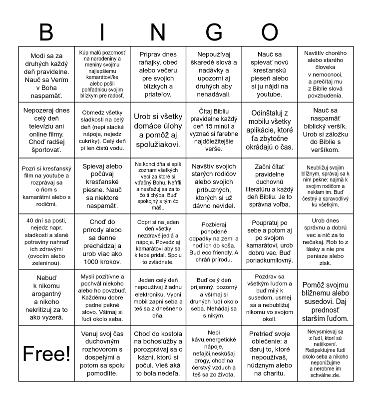 This bingo card has 41 words: 40 dní sa posti, nejedz napr. sladkosti a slané potraviny nahraď ich zdravými (ovocím alebo zeleninou)., Spievaj alebo počúvaj kresťanské piesne. Nauč sa niektoré naspamäť., Daj si záväzok: jeden deň bez počítača a mobilu a choď na čerstvý radšej vzduch., Nepoužívaj škaredé slová a nadávky a upozorni aj druhých aby nenadávali., Poupratuj po sebe a potom aj po svojom kamarátovi, urob dobrú vec. Buď poriadkumilovný., Pomôž svojmu blížnemu alebo susedovi. Daj prednosť starším ľuďom., Modi sa za druhých každý deň pravidelne. Nauč sa Verím v Boha naspamäť., Obmedz hluk a skús prežiť jeden deň v tichu a premýšľaj nad sebou ako sa správaš., Priprav dnes raňajky, obed alebo večeru pre svojich blízkych a priateľov., Čítaj Bibliu pravidelne každý deň 15 minút a vyznač si farebne najdôležitejšie verše., Odinštaluj z mobilu všetky aplikácie, ktoré ťa zbytočne okrádajú o čas., Nauč sa naspamäť biblický veršík. Urob si záložku do Biblie s veršíkom., Nepozeraj dnes celý deň televíziu ani online filmy. Choď radšej športovať., Choď do prírody alebo sa denne prechádzaj a urob viac ako 1000 krokov., Urob si všetky domáce úlohy a pomôž aj spolužiakovi., Navštív svojich starých rodičov alebo svojich príbuzných, ktorých si už dávno nevidel., Pretrieď svoje oblečenie: a daruj to, ktoré nepoužívaš, núdznym alebo na charitu., Navštív chorého alebo starého človeka v nemocnoci, a prečítaj mu z Biblie slová povzbudenia., Nebuď k nikomu arogantný a nikoho nekritizuj za to ako vyzerá., Obmedz všetky sladkosti na celý deň (nepi sladké nápoje, nejedz cukríky). Celý deň pi len čistú vodu., Na konci dňa si spíš zoznam všetkých vecí za ktoré si vďačný Bohu. Nefrfli a nesťažuj sa za to čo ti chýba. Buď spokojný s tým čo máš.., Pozbieraj pohodené odpadky na zemi a hoď ich do koša. Buď eco friendly. A chráň prírodu., Pozdrav sa všetkým ľuďom a buď milý k susedom, usmej sa a nebubližuj nikomu vo svojom okolí., Urob dnes správnu a dobrú vec a nič za to nečakaj. Rob to z lásky a nie pre peniaze alebo zisk., Free!, Mysli pozitívne a pochvál niekoho alebo ho povzbuď. Každému dobre padne pekné slovo. Všimaj si ľudí okolo seba., Jeden celý deň nepoužívaj žiadnu elektroniku. Vypni mobil zapni seba a teš sa z dnešného dňa., Modli sa za všetkých chudobných a trpiacich ľudí, za nezamestnaných a za bezdomovcov. Myslí na ľudí, ktorí zápasia so závislosťami., Nauč sa spievať novú kresťanskú pieseň alebo si ju nájdi na youtube., Nevysmievaj sa z ľudí, ktorí sú nešikovní. Rešpektujme ľudí okolo seba a nikoho neponižujme a nerobme im schválne zle., Podeľ sa s desiatou alebo kúp niekomu jedlo alebo ho pozvi na čaj do bufetu. Požičaj aj školské pomôcky alebo iné veci. Nebuď skúpy a lakomý., Kúp malú pozornosť na narodeniny a meniny svojmu najlepšiemu kamarátovi/ke alebo pošli pohľadnicu svojim blízkym pre radosť., Odpri si na jeden deň všetky nezdravé jedlá a nápoje. Povedz aj kamarátovi aby sa k tebe pridal. Spolu to zvládnete., Nepi kávu,energetické nápoje, nefajči,neskúšaj drogy, choď na čerstvý vzduch a teš sa zo života., Začni čítať pravidelne duchovnú literatúru a každý deň Bibliu. Je to správna voľba., Neubližuj svojim blížnym, správaj sa k nim pekne: najmä k svojim rodičom a neklam im. Buď čestný a spravodlivý ku všetkým., Pozri si kresťanský film na youtube a rozprávaj sa o ňom s kamarátmi alebo s rodičmi., Venuj svoj čas duchovným rozhovorom s dospelými a potom sa spolu pomodlíte., Choď do kostola na bohoslužby a porozprávaj sa o kázni, ktorú si počul. Vieš aká to bola nedeľa., Buď celý deň príjemný, pozorný a všímaj si druhých ľudí okolo seba. Nehádaj sa s nikým. and Nebuď egoistický a urážlivý. Ovládaj svoj hnev a svoje zlozvyky. Nebuď lenivý ale sa snaž a zapájaj sa do diskusie..