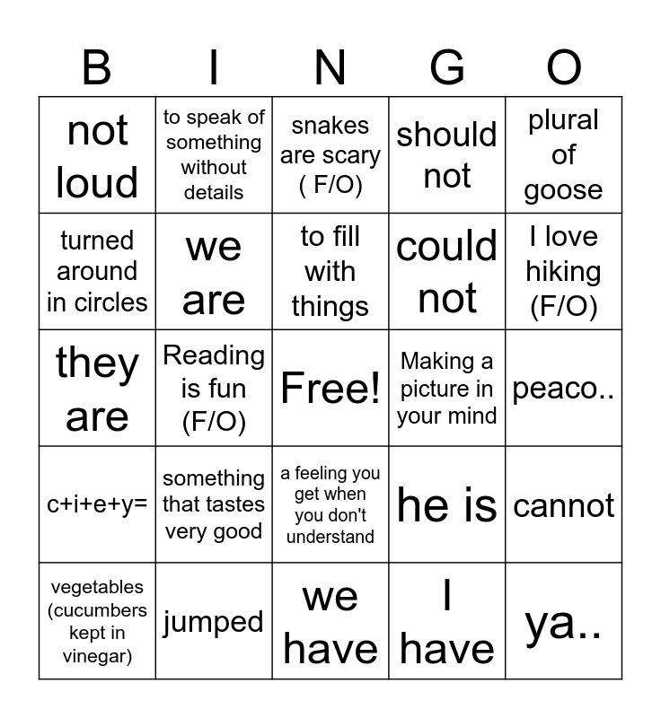 This bingo card has a free space and 24 words: something that tastes very good, jumped, to fill with things, vegetables (cucumbers kept in vinegar), plural of goose, not loud, turned around in circles, to speak of something without details, Making a picture in your mind, a feeling you get when you don't understand, could not, they are, he is, cannot, we are, I have, peaco.., snakes are scary ( F/O), I love hiking (F/O), Reading is fun (F/O), ya.., c+i+e+y=, should not and we have.
