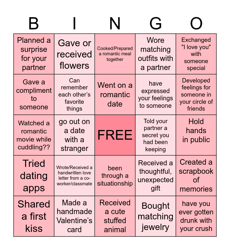 This bingo card has a free space and 24 words: Shared a first kiss, Wrote/Received a handwritten love letter from a co-worker/classmate, Went on a romantic date, Bought matching jewelry, Exchanged "I love you" with someone special, Planned a surprise for your partner, Gave or received flowers, Cooked/Prepared a romantic meal together, Told your partner a secret you had been keeping, Hold hands in public, Watched a romantic movie while cuddling??, Can remember each other’s favorite things, Received a thoughtful, unexpected gift, Created a scrapbook of memories, Gave a compliment to someone, Made a handmade Valentine’s card, Received a cute stuffed animal, Wore matching outfits with a partner, Developed feelings for someone in your circle of friends, Tried dating apps, go out on a date with a stranger, been through a situationship, have expressed your feelings to someone and have you ever gotten drunk with your crush.