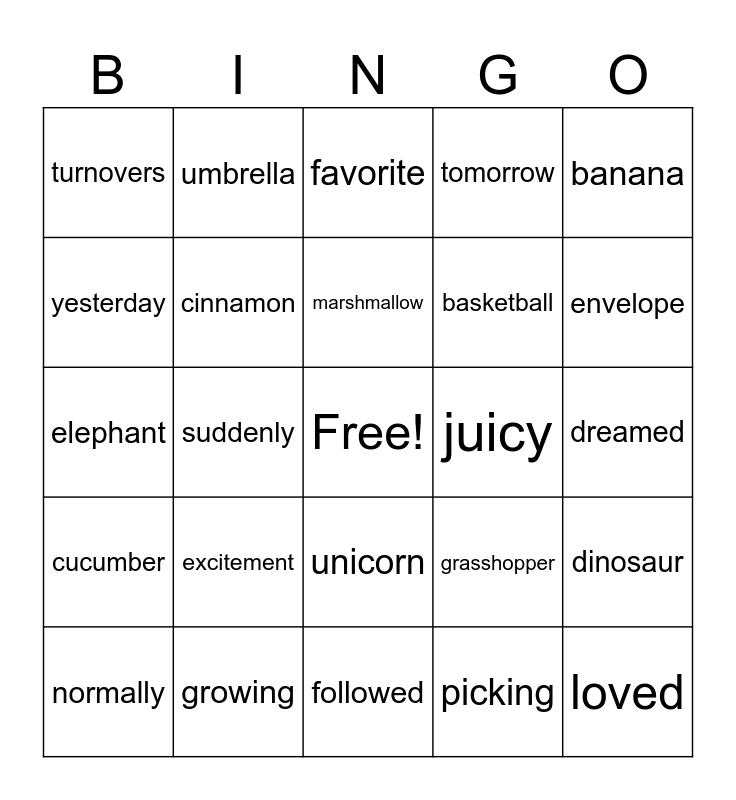 This bingo card has a free space and 29 words: normally, carefully, suddenly, tomatoes, turnovers, favorite, cinnamon, excitement, juicy, growing, dreamed, loved, followed, picking, envelope, bicycle, unicorn, cucumber, banana, elephant, grasshoppеr, lollipop, basketball, yesterday, tomorrow, umbrella, dinosaur, marshmallow and lemonade.