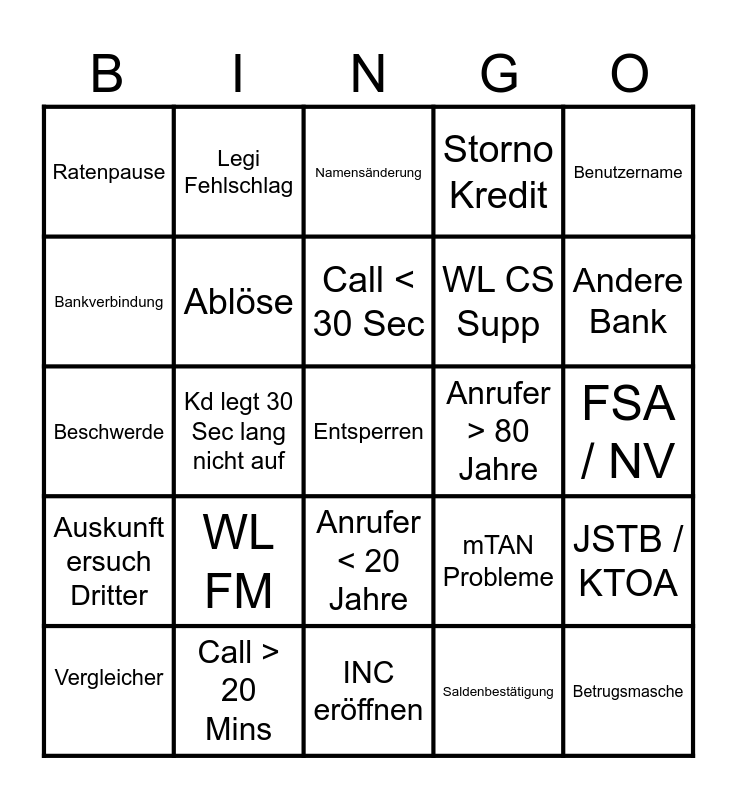 This bingo card has a free space and 24 words: WL FM, Call > 20 Mins, Call < 30 Sec, Vergleicher, Benutzername, Ratenpause, Bankverbindung, Legi Fehlschlag, Anrufer > 80 Jahre, Anrufer < 20 Jahre, WL CS Supp, Beschwerde, mTAN Probleme, JSTB / KTOA, Ablöse, Saldenbestätigung, FSA / NV, Namensänderung, Andere Bank, Kd legt 30 Sec lang nicht auf, Betrugsmasche, Auskunft ersuch Dritter, Storno Kredit and INC eröffnen.