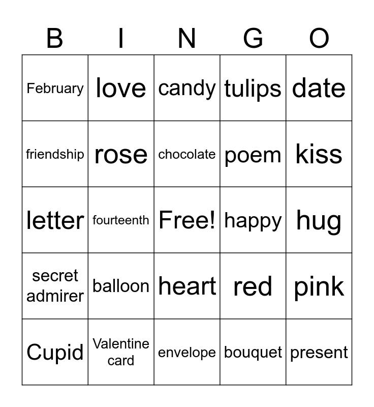 This bingo card has a free space and 24 words: balloon, Valentine card, chocolate, Cupid, date, February, friendship, love, happy, heart, poem, letter, red, pink, rose, bouquet, hug, candy, kiss, fourteenth, present, secret admirer, tulips and envelope.