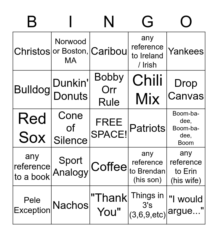 This bingo card has a free space and 24 words: Sport Analogy, Nachos, Bobby Orr Rule, Pele Exception, Yankees, Christos, Bulldog, Norwood or Boston, MA, Patriots, Coffee, Chili Mix, Red Sox, any reference to Brendan (his son), any reference to Erin (his wife), Dunkin' Donuts, Things in 3's (3,6,9,etc), Boom-ba-dee, Boom-ba-dee, Boom, Caribou, Drop Canvas, Cone of Silence, "I would argue...", any reference to a book, any reference to Ireland / Irish and "Thank You".