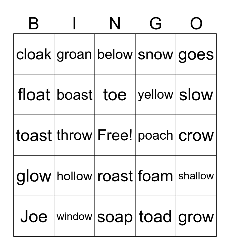 This bingo card has a free space and 24 words: hollow, window, toe, Joe, goes, cloak, float, groan, poach, roast, yellow, toast, foam, shallow, boast, toad, crow, below, slow, throw, grow, glow, snow and soap.