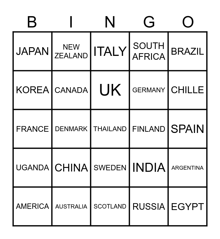 This bingo card has a free space and 24 words: CHINA, AUSTRALIA, UK, AMERICA, BRAZIL, JAPAN, KOREA, NEW ZEALAND, FINLAND, SWEDEN, GERMANY, FRANCE, INDIA, ARGENTINA, CANADA, RUSSIA, SPAIN, ITALY, CHILLE, DENMARK, EGYPT, UGANDA, SOUTH AFRICA and SCOTLAND.