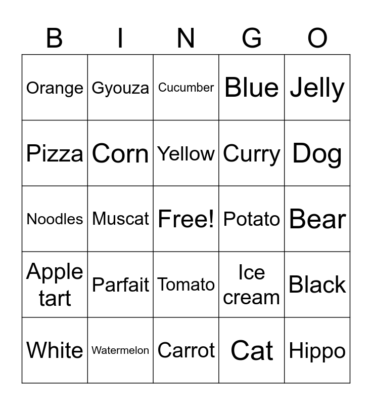 This bingo card has a free space and 30 words: Watermelon, Apple, Muscat, Strawberry, Orange, Cucumber, Corn, Tomato, Potato, Carrot, Bear, Hippo, Cat, Penguin, Dog, Pudding, Ice cream, Apple tart, Parfait, Jelly, Noodles, Yakiniku, Gyouza, Curry, Pizza, Blue, Black, White, Yellow and Purple.