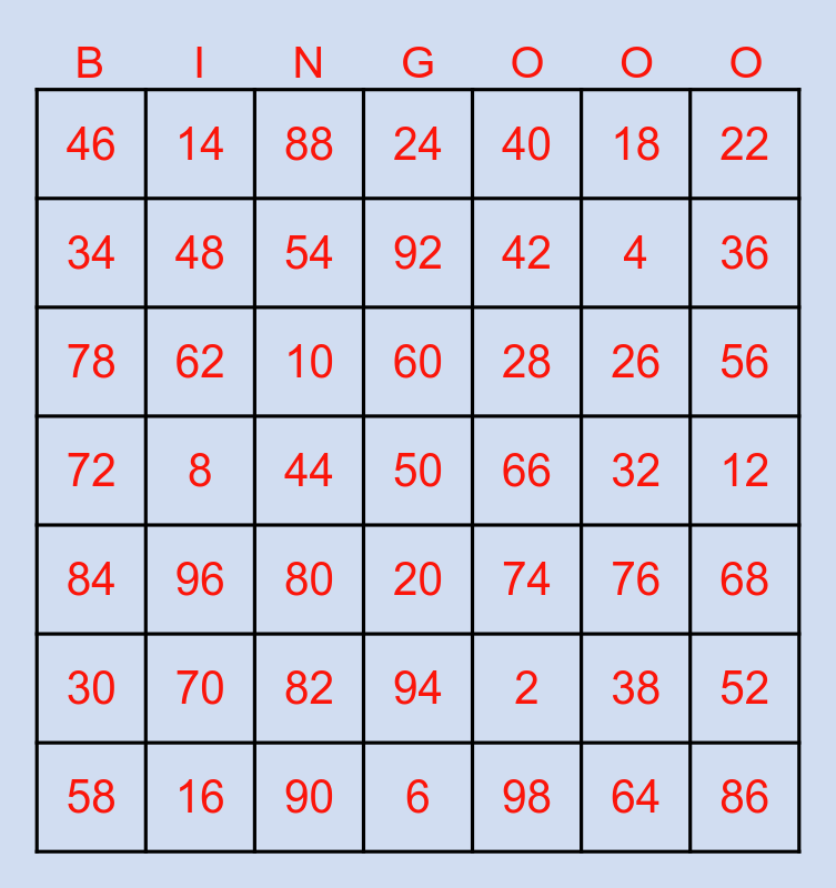 This bingo card has a free space and 48 words: 2, 4, 6, 8, 10, 12, 14, 16, 18, 20, 22, 24, 26, 28, 30, 32, 34, 36, 38, 40, 42, 44, 46, 48, 52, 54, 56, 58, 60, 62, 64, 66, 68, 70, 72, 74, 76, 78, 80, 82, 84, 86, 88, 90, 92, 94, 96 and 98.