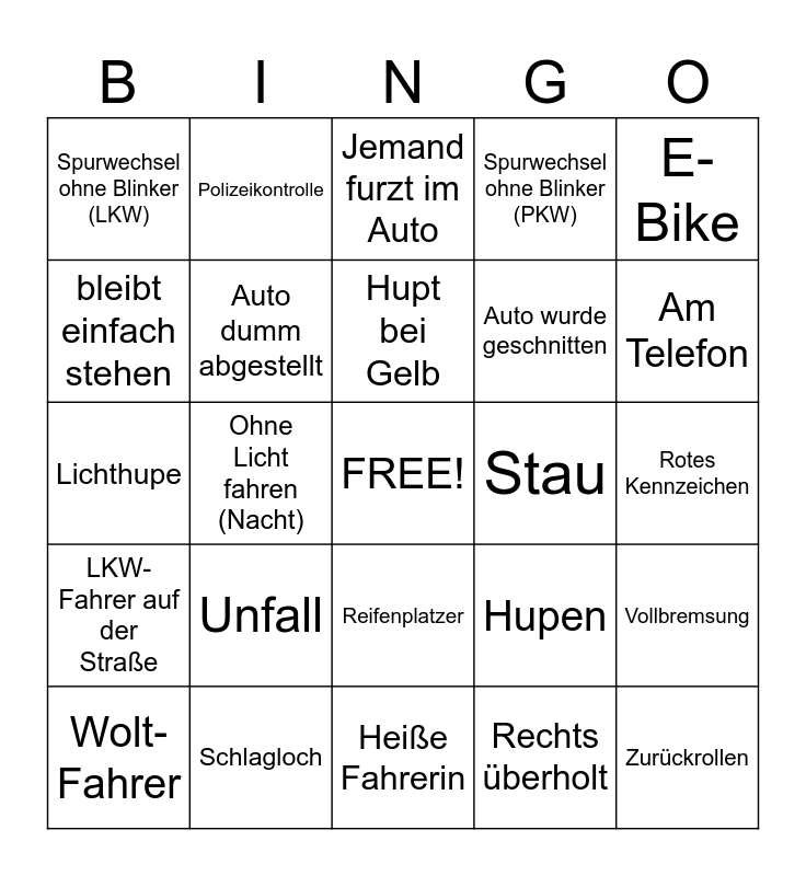 This bingo card has a free space and 24 words: Unfall, Schlagloch, Hupt bei Gelb, Wolt-Fahrer, E-Bike, Spurwechsel ohne Blinker (LKW), bleibt einfach stehen, Polizeikontrolle, Stau, Reifenplatzer, Auto wurde geschnitten, Lichthupe, Hupen, Vollbremsung, Auto dumm abgestellt, Rechts überholt, Rotes Kennzeichen, Jemand furzt im Auto, Am Telefon, Ohne Licht fahren (Nacht), Zurückrollen, LKW-Fahrer auf der Straße, Spurwechsel ohne Blinker (PKW) and Heiße Fahrerin.