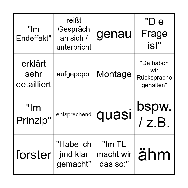 This bingo card has 16 words: "Habe ich jmd klar gemacht", bspw. / z.B., genau, "Im Endeffekt", "Im Prinzip", reißt Gespräch an sich / unterbricht, quasi, "Im TL macht wir das so:", erklärt sehr detailliert, aufgepoppt, forster, "Die Frage ist", entsprechend, "Da haben wir Rücksprache gehalten", Montage and ähm.