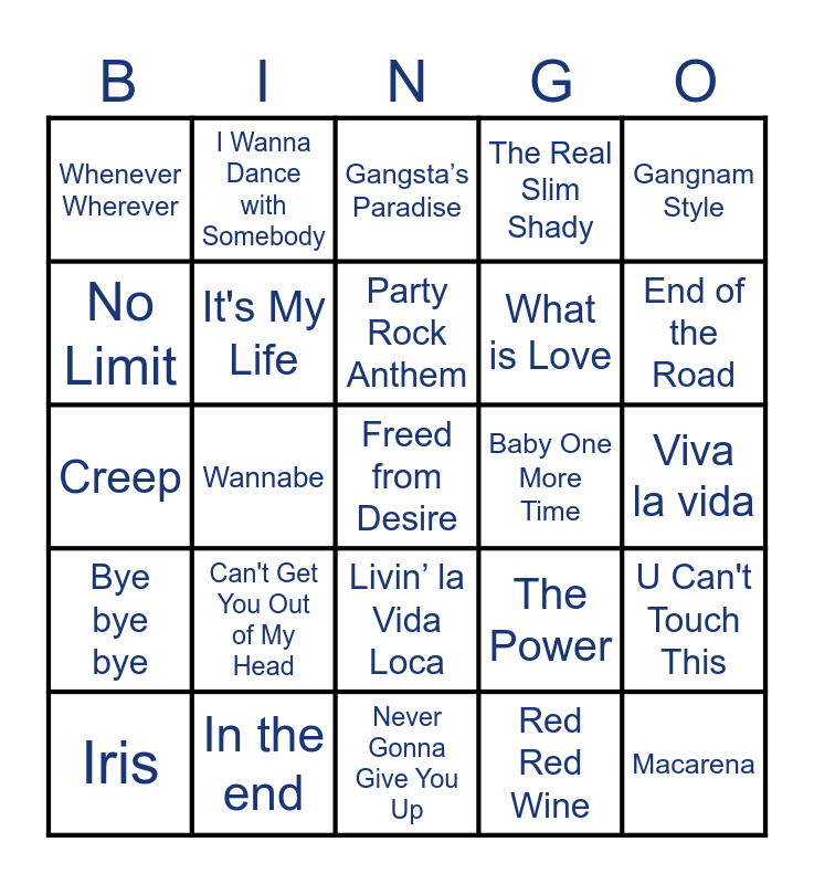 This bingo card has 50 words: I Want to Break Free, Freed from Desire, Smells Like Teen Spirit, Never Gonna Give You Up, Can't Get You Out of My Head, I Gotta Feeling, I Wanna Dance with Somebody, Barbie Girl, No Limit, The Rhythm of the Night, It's My Life, The Real Slim Shady, U Can't Touch This, The Power, Everybody, Sweet Child O' Mine, Party Rock Anthem, Baby One More Time, Livin' on a Prayer, Gangnam Style, Wannabe, Red Red Wine, Whenever Wherever, What is Love, The Ketchup Song, Macarena, End of the Road, Wonderwall, Gangsta’s Paradise, Livin’ la Vida Loca, I want it that way, Torn, No scrubs, Smooth, In the end, Crazy in love, Hey ya!, Unbrella, Just dance, Viva la vida, Stan, In da club, Yeah!, Killing me softly, Iris, Creep, Hot in here, Complicated, Bye bye bye and Fireflies.