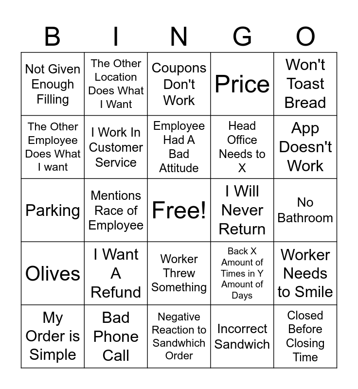 This bingo card has a free space and 24 words: I Want A Refund, Bad Phone Call, Employee Had A Bad Attitude, My Order is Simple, Won't Toast Bread, Not Given Enough Filling, The Other Employee Does What I want, The Other Location Does What I Want, I Will Never Return, Worker Threw Something, Head Office Needs to X, Parking, Back X Amount of Times in Y Amount of Days, Worker Needs to Smile, I Work In Customer Service, Incorrect Sandwich, No Bathroom, Coupons Don't Work, App Doesn't Work, Mentions Race of Employee, Closed Before Closing Time, Olives, Price and Negative Reaction to Sandwhich Order.