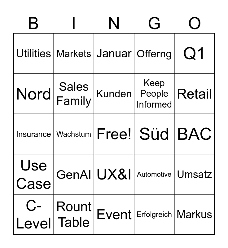 This bingo card has a free space and 24 words: GenAI, Rount Table, Kunden, C-Level, Q1, Utilities, Nord, Markets, Süd, UX&I, Keep People Informed, Insurance, Automotive, Umsatz, Sales Family, Erfolgreich, BAC, Januar, Retail, Wachstum, Markus, Use Case, Offerng and Event.