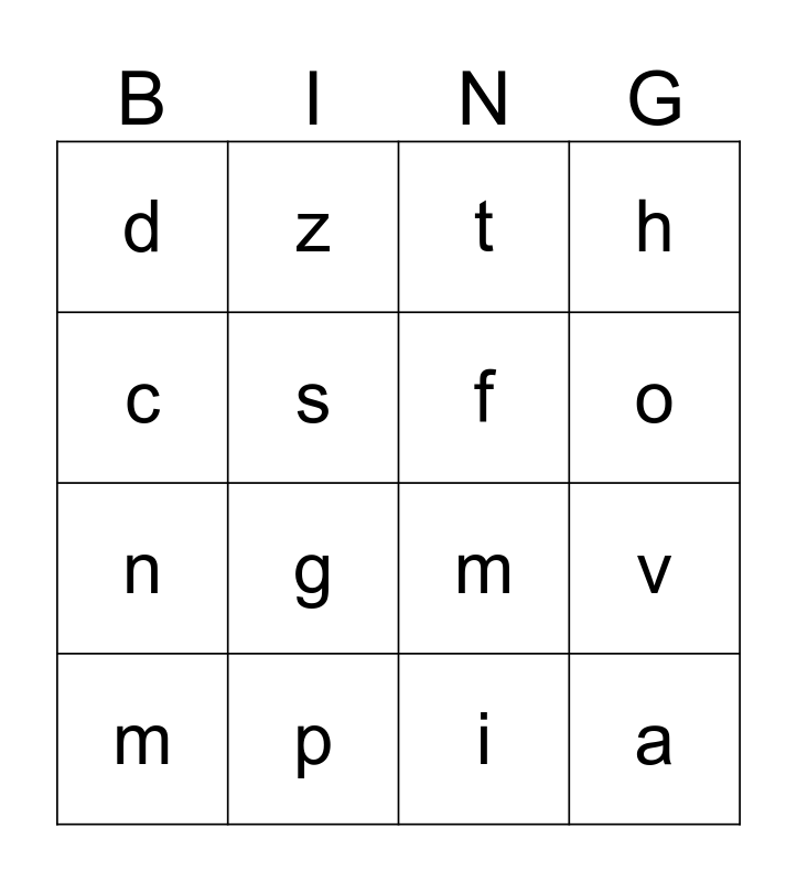 This bingo card has a free space and 15 words: m, a, t, d, o, c, g, i, s, n, v, h, f, z and p.