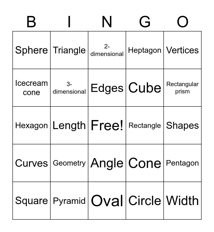 This bingo card has a free space and 24 words: Square, Geometry, Edges, Circle, Vertices, Sphere, Triangle, 2-dimensional, Rectangle, Shapes, Hexagon, 3-dimensional, Cone, Pentagon, Icecream cone, Pyramid, Oval, Heptagon, Rectangular prism, Curves, Length, Angle, Cube and Width.