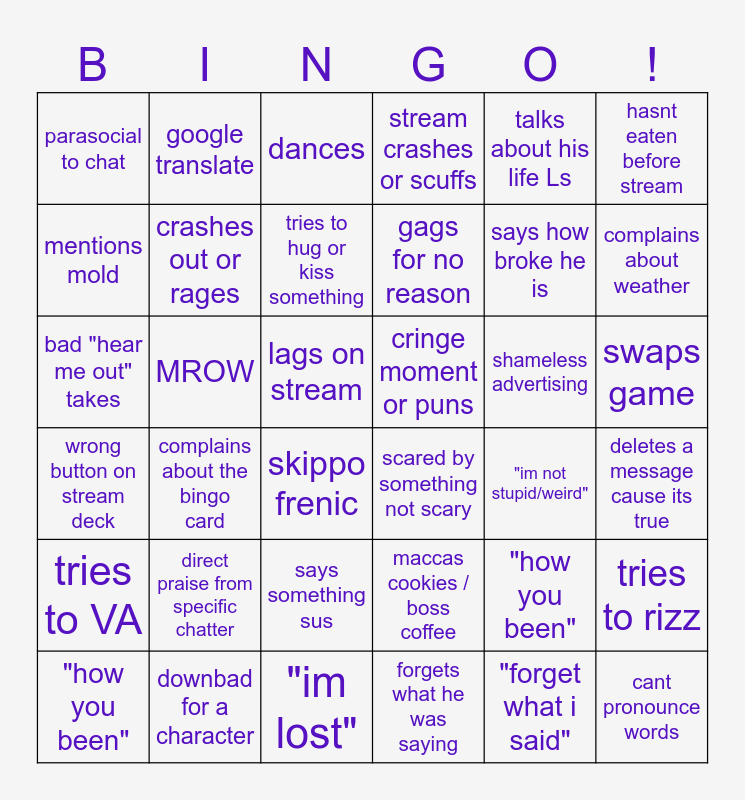 This bingo card has 36 words: maccas cookies / boss coffee, says something sus, forgets what he was saying, mentions mold, wrong button on stream deck, cringe moment or puns, crashes out or rages, "im lost", talks about his life Ls, "how you been", complains about weather, stream crashes or scuffs, tries to rizz, MROW, gags for no reason, parasocial to chat, tries to VA, shameless advertising, bad "hear me out" takes, dances, lags on stream, complains about the bingo card, scared by something not scary, skippo frenic, "im not stupid/weird", google translate, says how broke he is, downbad for a character, tries to hug or kiss something, hasnt eaten before stream, cant pronounce words, "how you been", deletes a message cause its true, swaps game, direct praise from specific chatter and "forget what i said".
