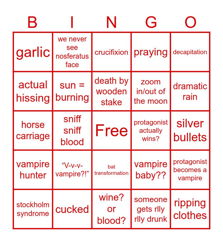 This bingo card has a free space and 24 words: “V-v-v-vampire?!”, cucked, death by wooden stake, stockholm syndrome, decapitation, garlic, actual hissing, we never see nosferatus face, protagonist actually wins?, bat transformation, zoom in/out of the moon, horse carriage, vampire baby??, protagonist becomes a vampire, sun = burning, someone gets rlly rlly drunk, silver bullets, crucifixion, dramatic rain, sniff sniff blood, ripping clothes, vampire hunter, praying and wine? or blood?.